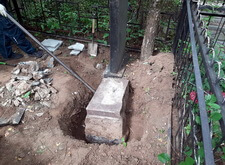 Первым делом мы принялись за демонтаж: сняли памятники с основания и поправили постаменты, надёжно укрепив их в земле. Таким образом мы избежали дальнейшего перекоса памятников и поставили оба надгробья на один уровень.