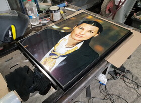 Затем из металлического профиля мы изготавливаем рамку, тыльную сторону которой закрывает прямоугольный белый фон. Распечатанный на плёнке портрет мы приклеиваем к вспененной основе для придания необходимого объёма и жесткости.