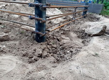 Завершив подготовительные работы, мы перешли непосредственно к могиле. Предварительно демонтировав уже установленную оградку и обе таблички, мы вырыли траншею по периметру участка. В каждый угол получившегося квадрата мы вкрутили сваи, которые послужили опорами каркаса из арматуры. Такая конструкция придаст бетонному цоколю необходимую жёсткость, обеспечит прочность, а также исключит вероятность провалов и перекосов.
