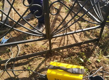 Предварительно убрав уже выросшие сорняки, мы привариваем к ножкам ограждения металлическую полосу. Она обозначает